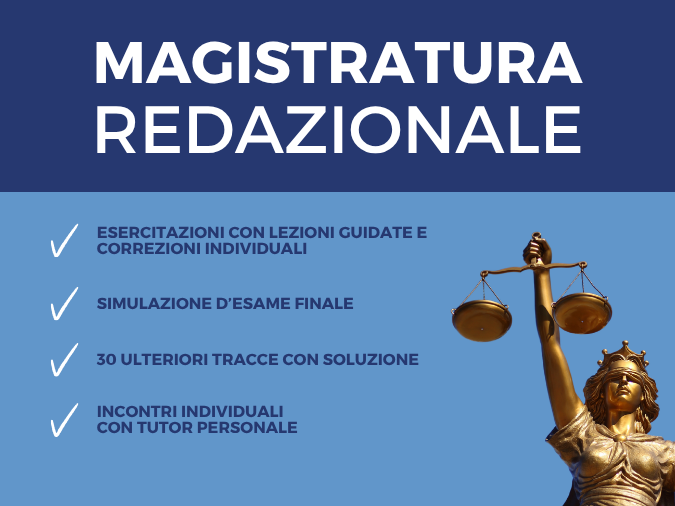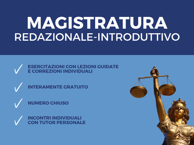 Il corso redazionale magistratura introduttivo gratuito di Lex Iuris si distingue per essere un modulo di ingresso, completamente gratuito, pensato per fornire una prima impostazione metodologica a chi si avvicina alla preparazione del concorso in magistratura.