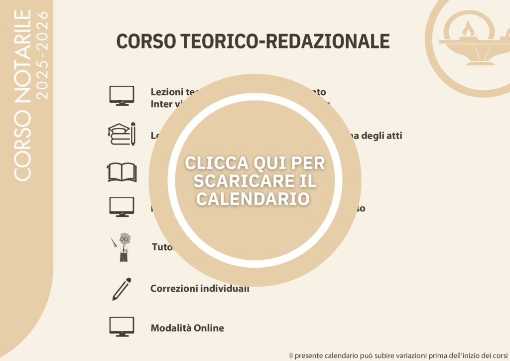 - Corso Redazionale, dedicato allo studio sulla forma degli atti notarili e all’analisi delle singole clausole. Saranno svolte 18 lezioni redazionali e 17 esercitazioni pratiche, con correzione individuale e incontri con il proprio tutor di riferimento.