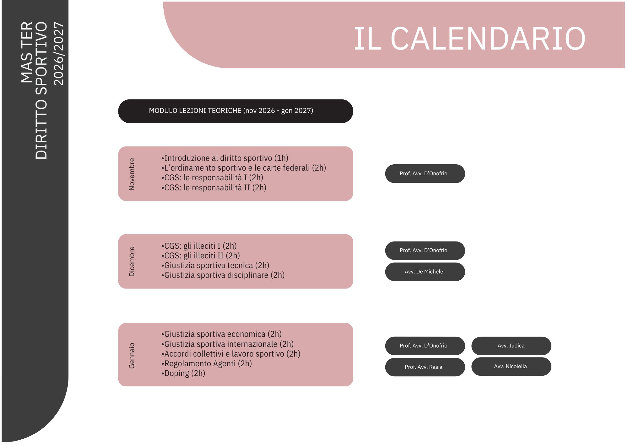 Il Modulo Teorico del Master ha l’obiettivo di fornire una solida base istituzionale e concettuale nel campo del diritto sportivo. E’ strutturato su 30 ore di lezione, con il fine principe di accompagnare gli studenti nell’acquisizione di una giusta metodologia giuridica e delle conoscenze istituzionali necessarie per poter affrontare il successivo Modulo del Master – il Modulo Esercitazioni Pratiche, che inizierà a Febbraio 2026.